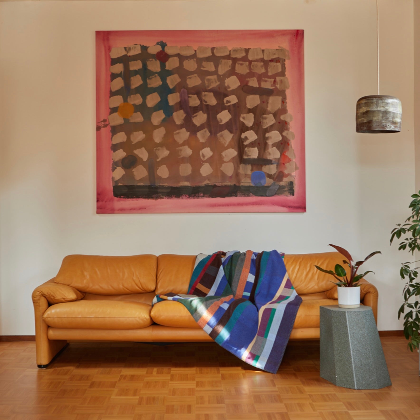 Woven with sumptuous merino lambswool and felted to create a super soft, inviting quality. Beautifully finished with blanket stitches, which adds an extra tactile detail to all its edges. This bold and contemporary design will be a colourful and uplifting addition to any home.
