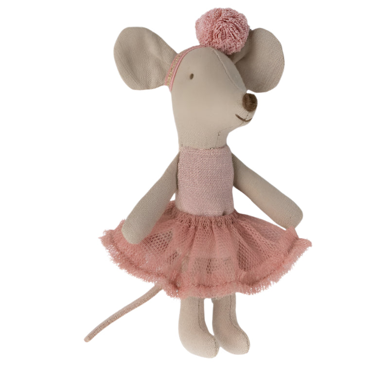 Maileg little sister mouse dressed up like a graceful ballerina. She wears a beautiful rose colored tutu and a beautiful headband - ready for hours of dance.