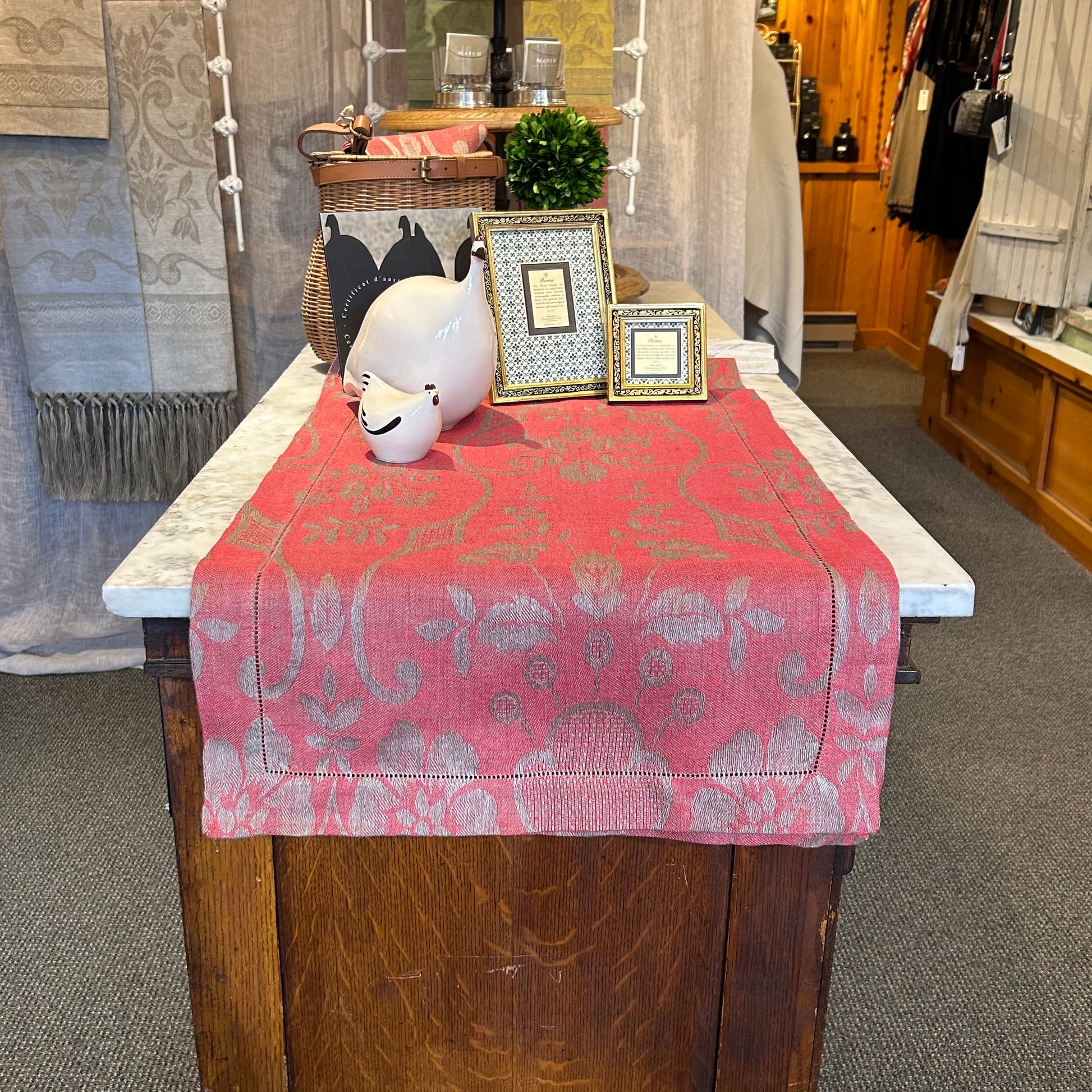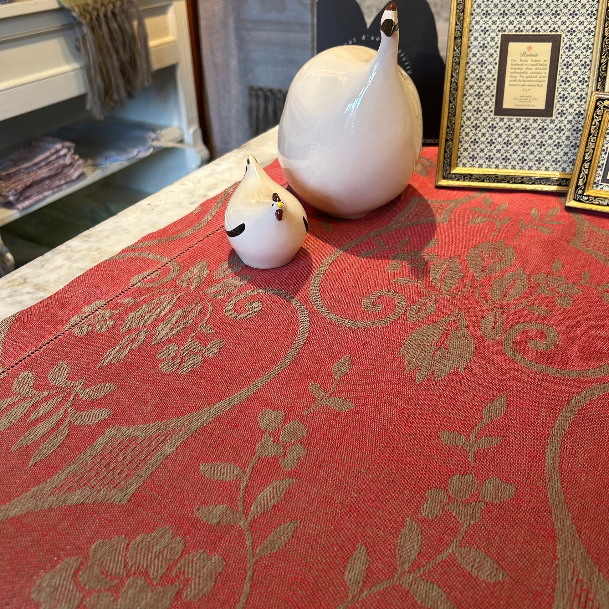 This Red Rustica Damasco Runner by Tessitura Pardi is made in Italy. Featuring a red hue, this linen table runner is about 51 inches long.