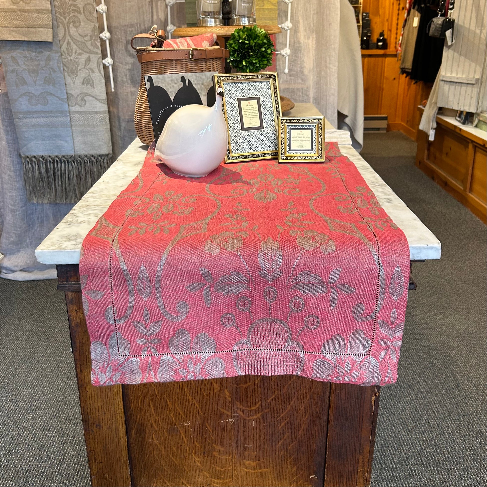 This Red Rustica Damasco Runner by Tessitura Pardi is made in Italy. Featuring a red hue, this linen table runner is about 70 inches long.