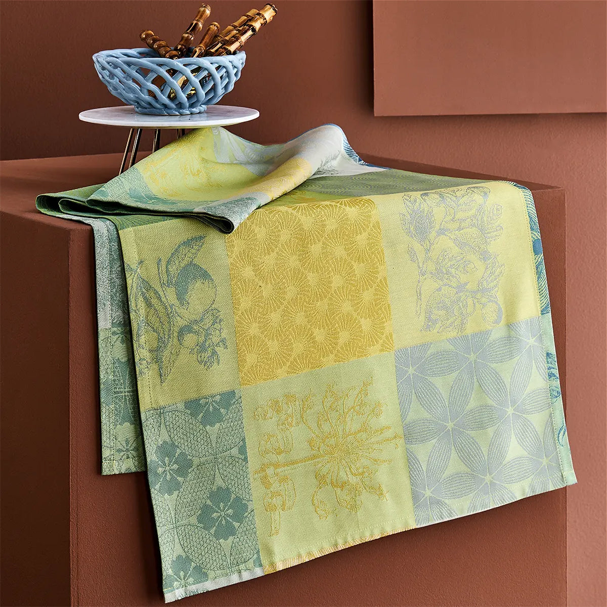 Discover the green, yellow, and blue patchwork design of the Mille Parfums Limoni Tablerunner with flowers, fruit, and geometric motifs. This woven design was crafted from original artwork, hand-drawn by our in-house team of textile artisans & designers in France. Constructed on jacquard looms with extra long staple cotton, Garnier Thiebaut USA's jacquard table linen collections are woven for longevity, and can last for generations with the proper washing maintenance and use.