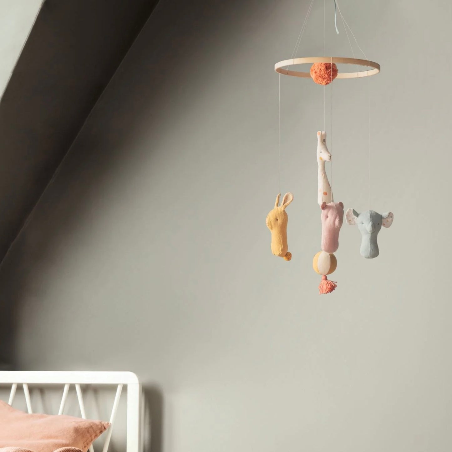Maileg Lullaby friends is a collection with beautiful baby items. This mobile is perfect for the baby to look at from the bed or from the nursery table. The animals are made in soft fabrics with unique prints and are packed in a beautiful gift box.
