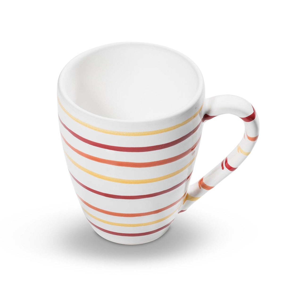 Select this sleek, handmade mug from Gmundner Keramik, showcasing the summery Sunset design, for your daily breakfasts. Featuring a bright and sunny red, orange, and yellow pattern. Made in Austria.