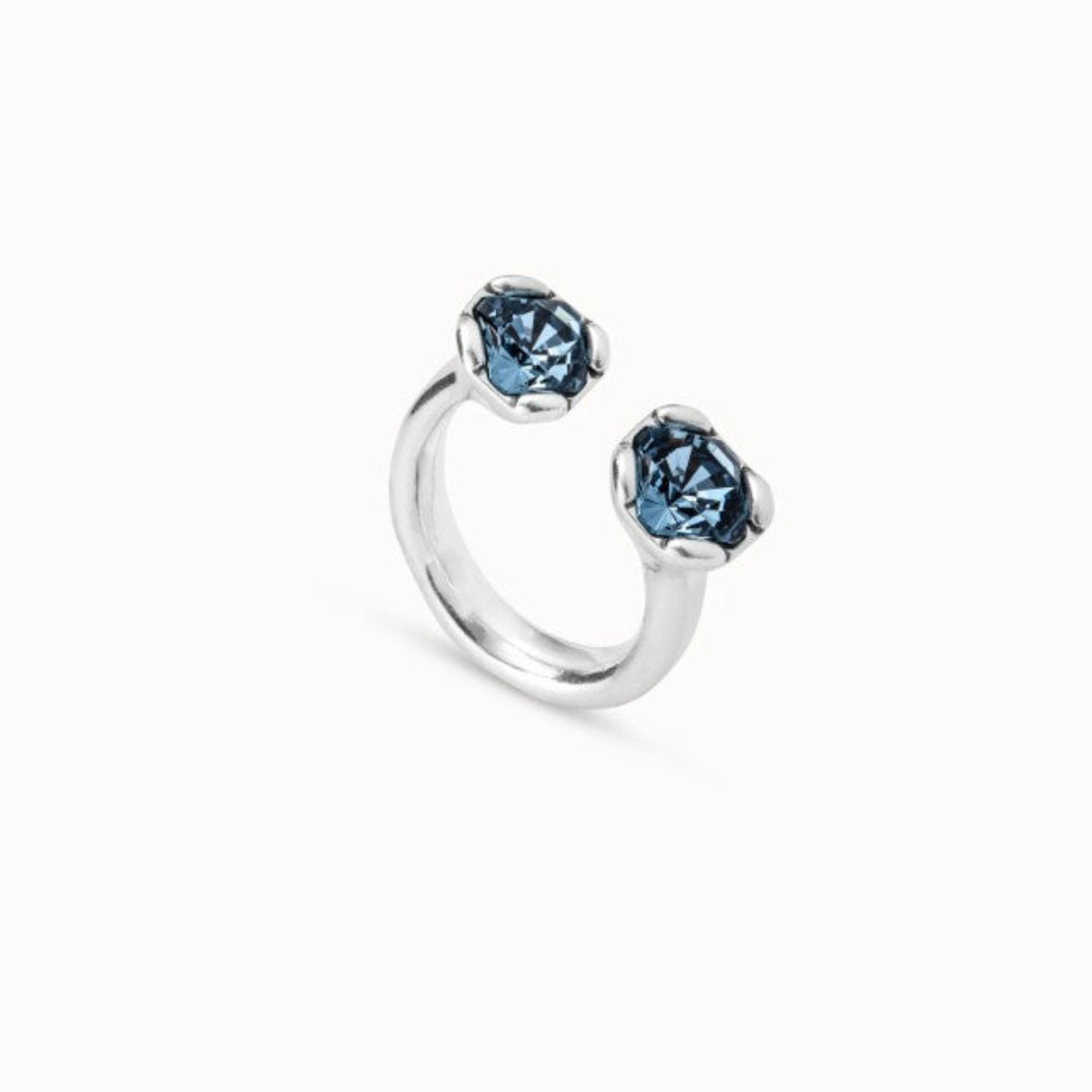 Sterling silver-plated ring with open design and two cases at its ends with two blue faceted crystals facing each other inside. The UNOde50 Charismatic collection represents the ability to attract, captivate and influence our surroundings; something that can only be achieved naturally.