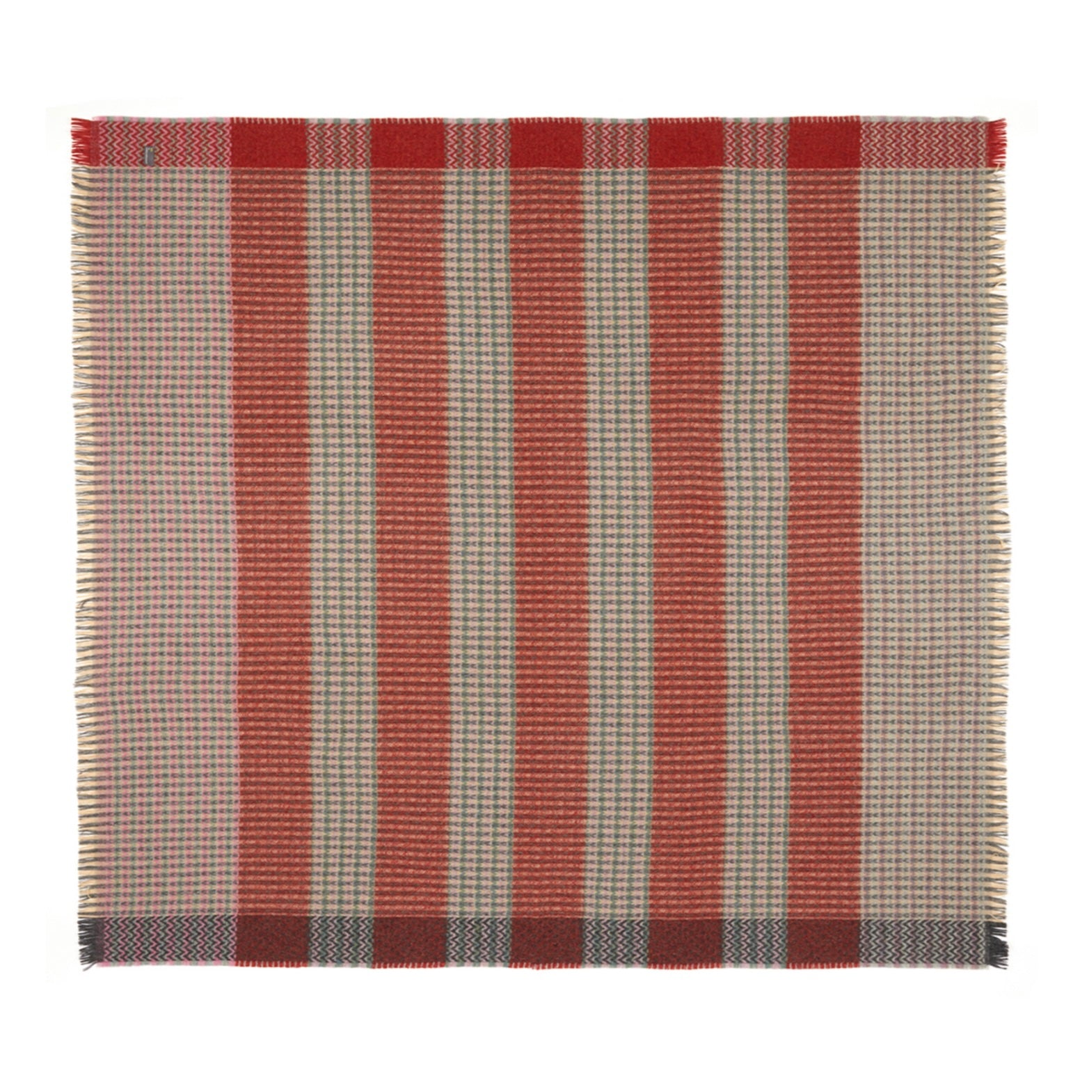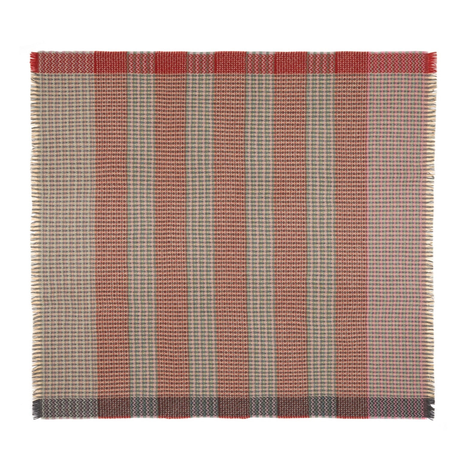 Contrasting woven structures create an intricately patterned throw woven in Shetland wool, suitable for both indoor and outdoor use.