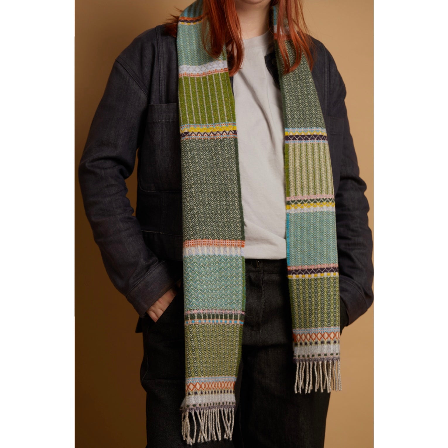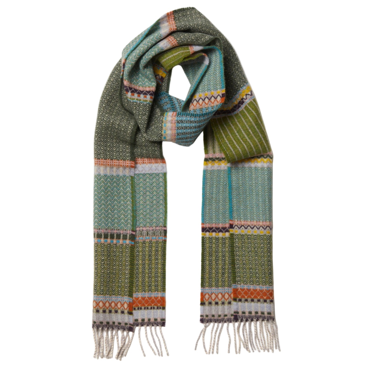 The Wallace Sewell Cassia Laurel Lambswool Pattern Scarf is a woven symphony of pattern and texture runs throughout this cosy merino lambswool scarf. It features a reversible central section giving the wearer multiple options.