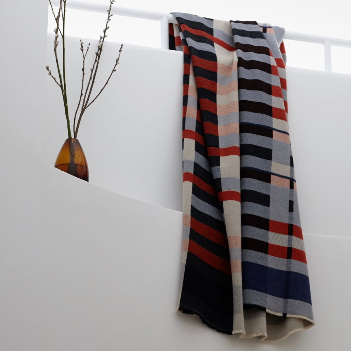 The Wallace Sewell Seal Stolzl Bauhaus Throw is a grey, pale blue paired with a bright tomato red and navy blue, this makes for a fresh and cheery colour palette.